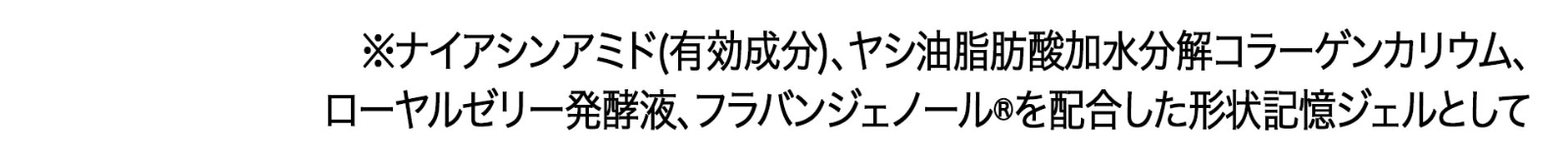 ※ナイアシンアミド(有効成分)、ヤシ油脂肪酸加水分解コラーゲンカリウム、ローヤルゼリー発酵液、フラバンジェノール®を配合した形状記憶ジェルとして